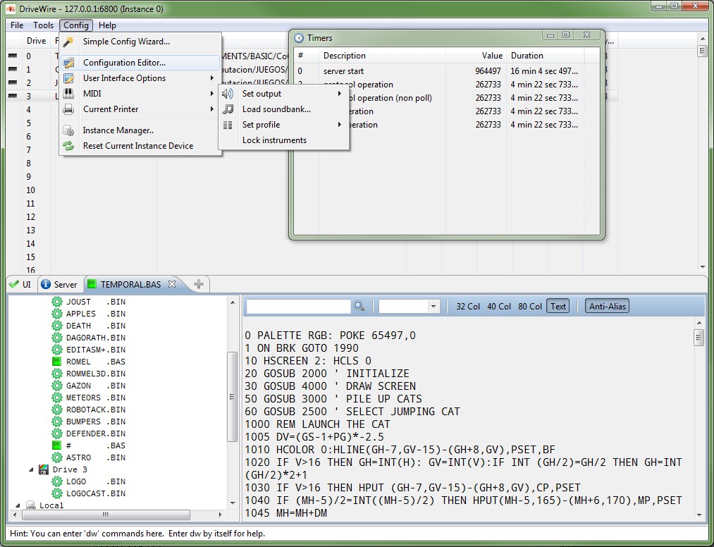 Using DriveWire 4 you can run a web server on your CoCo, host a multi line internet BBS, transfer files to and from remote computers, send email, control MIDI devices, telnet to and from your Coco, display graphical OS-9 windows on your modern PC, and much more.